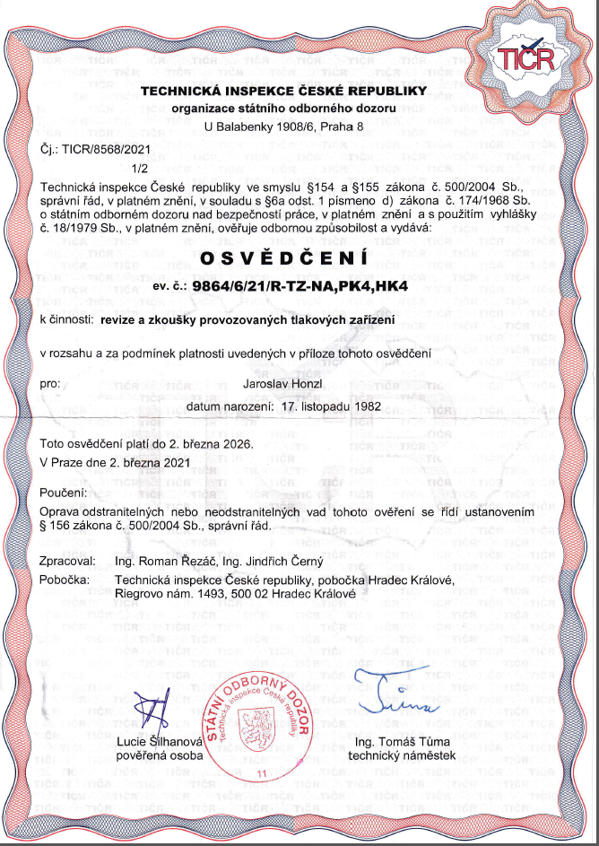 Osvědčení k činnosti: revize a zkoušky provozovaných kotlů a tlakových nádob